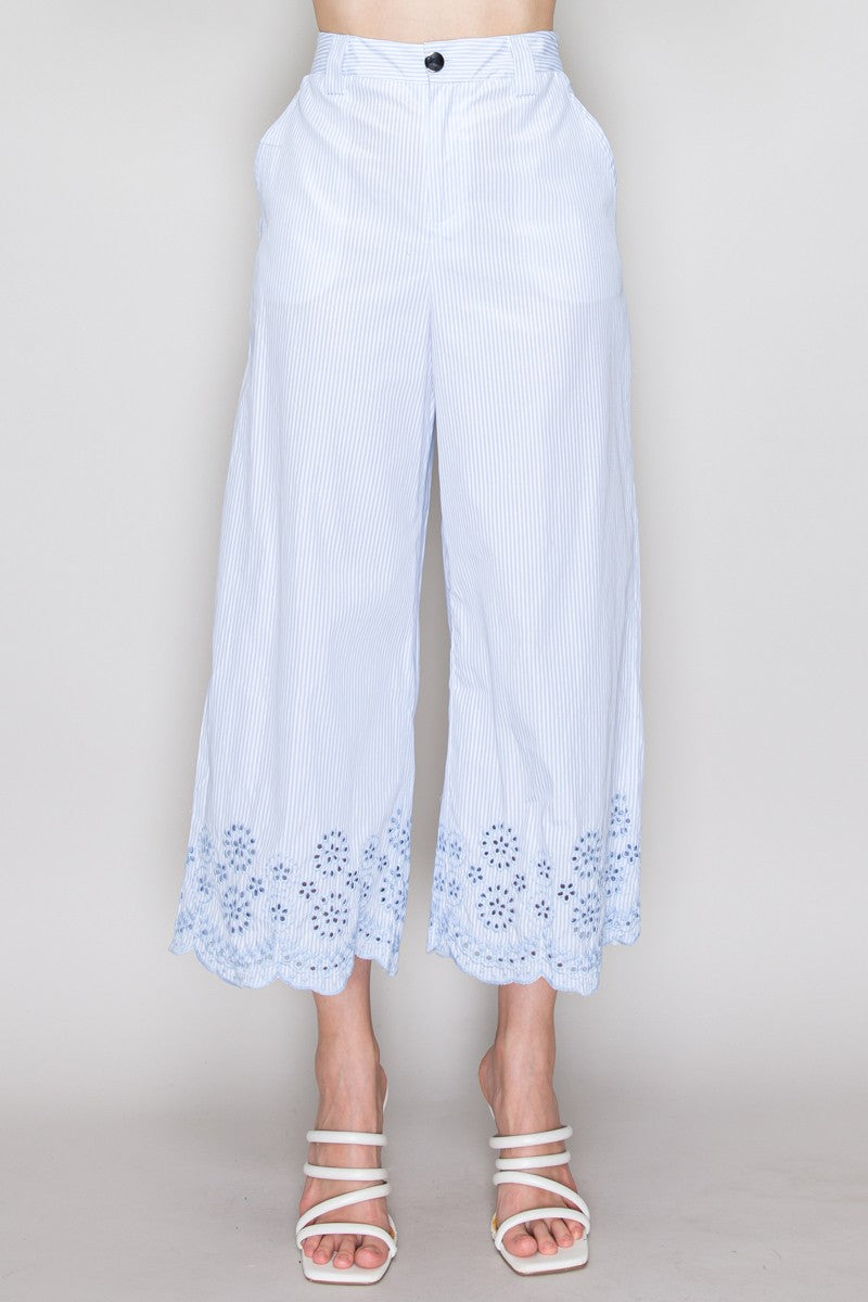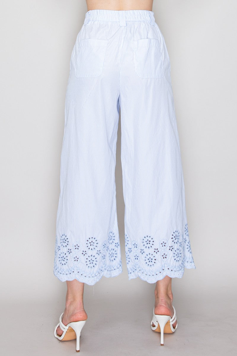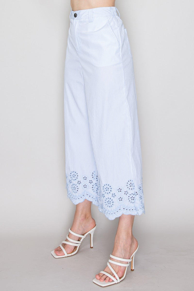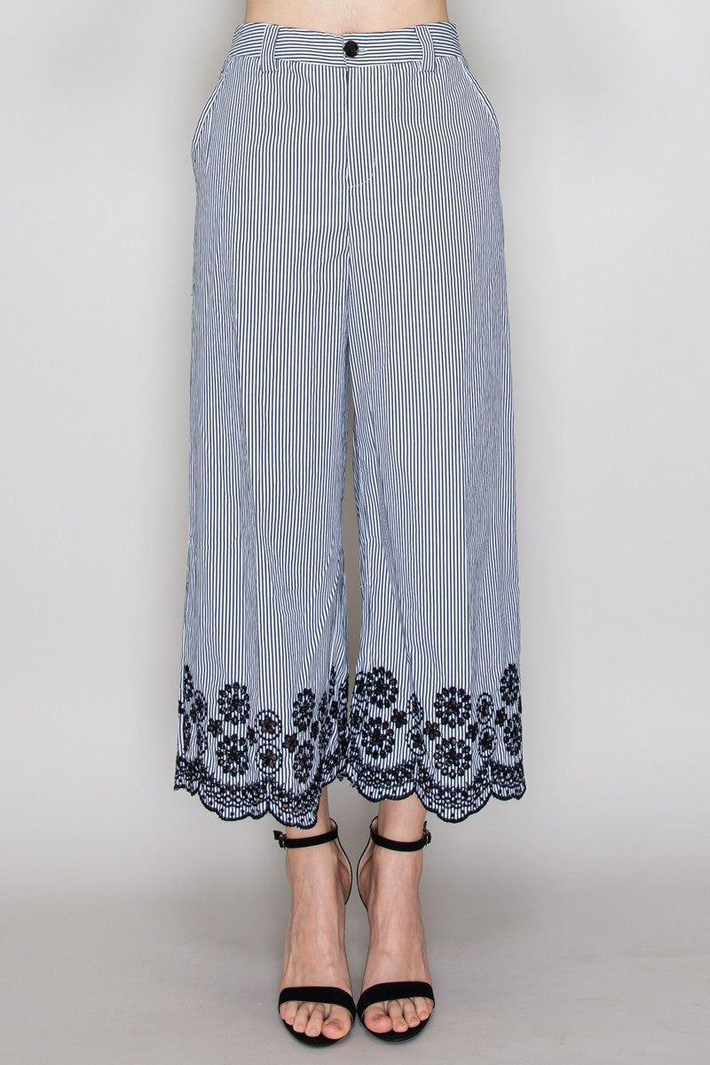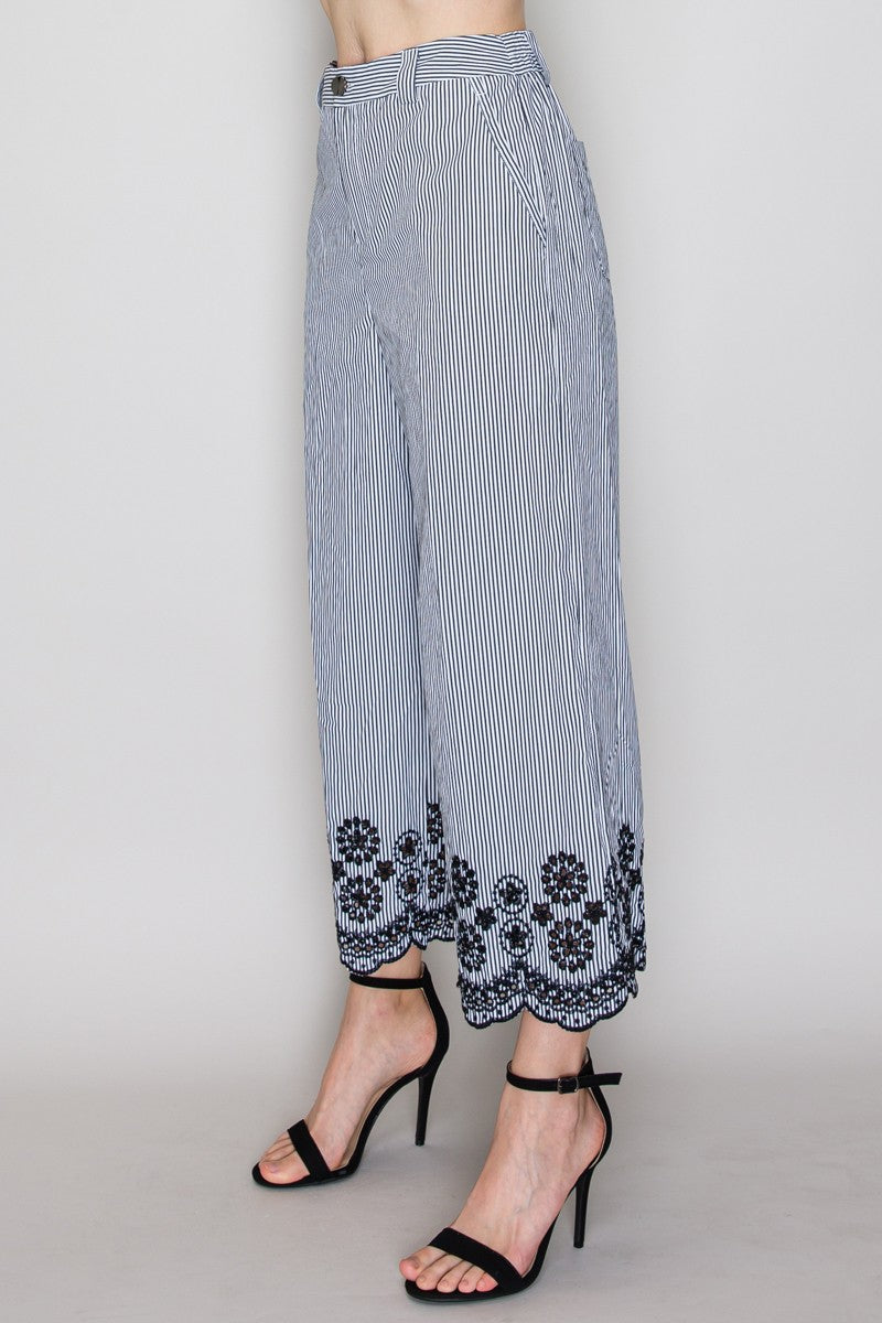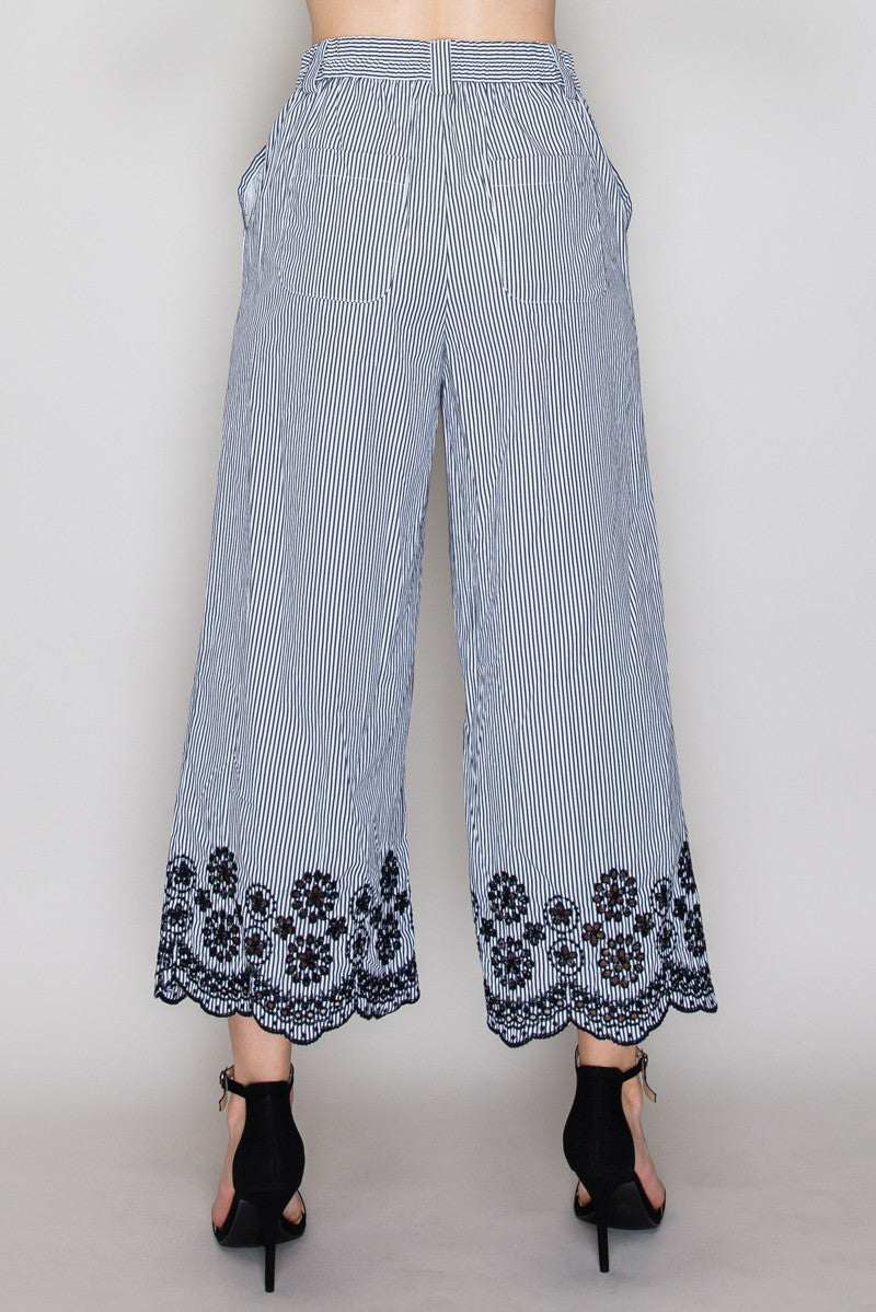 Pantalón de rayas con encaje en ruedo y corte amplio.