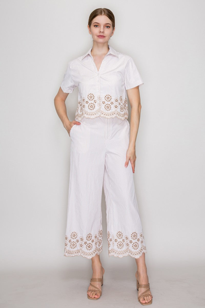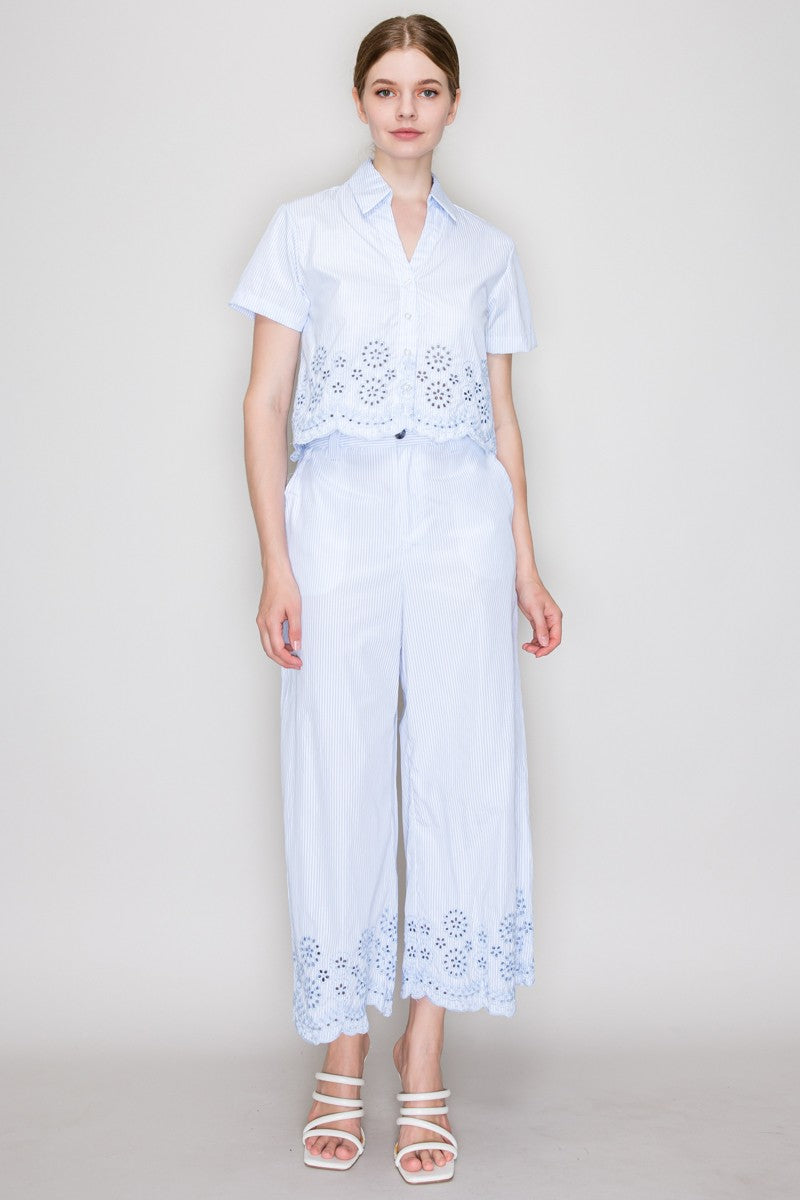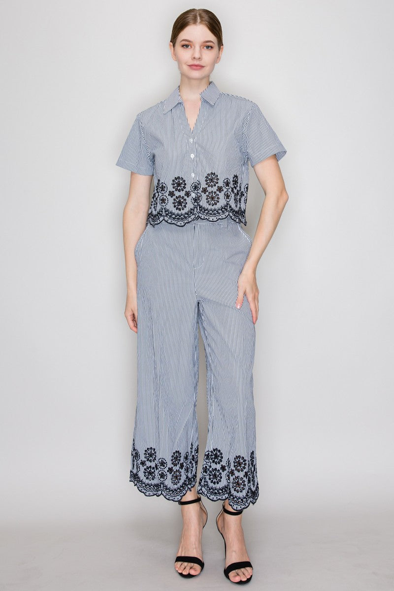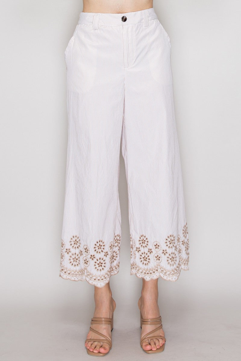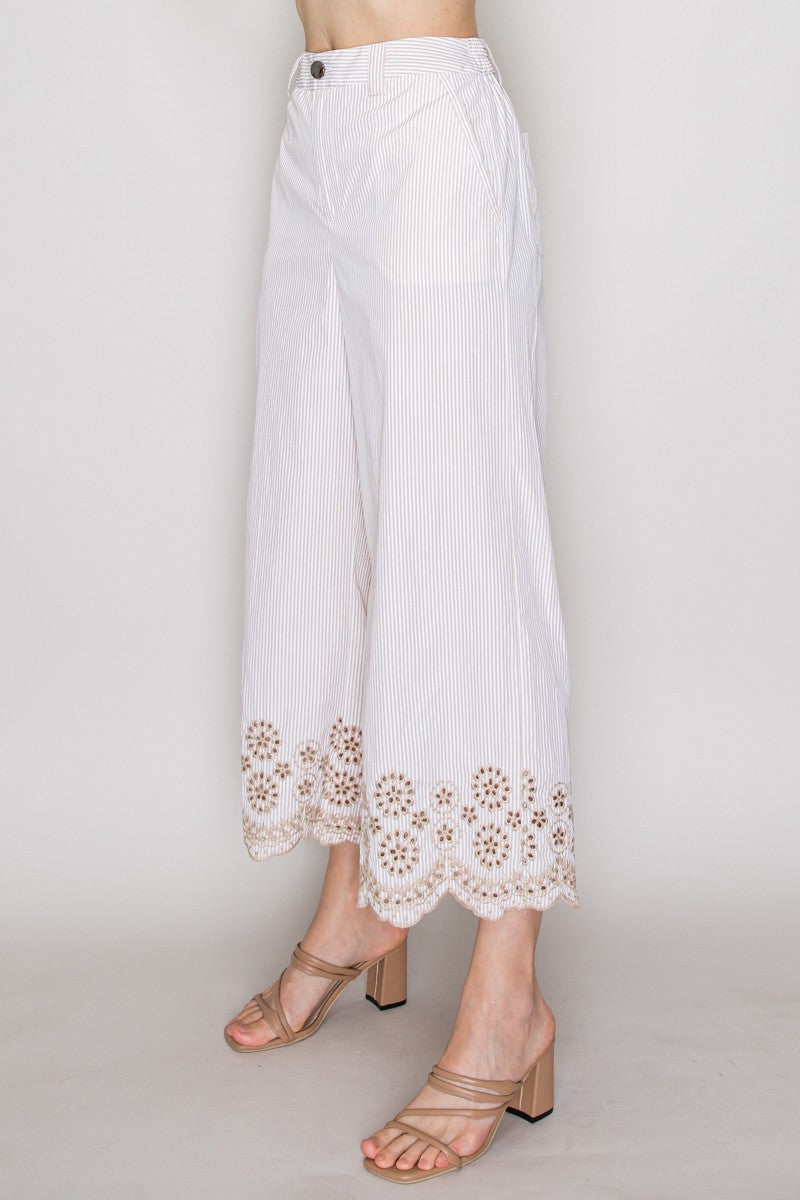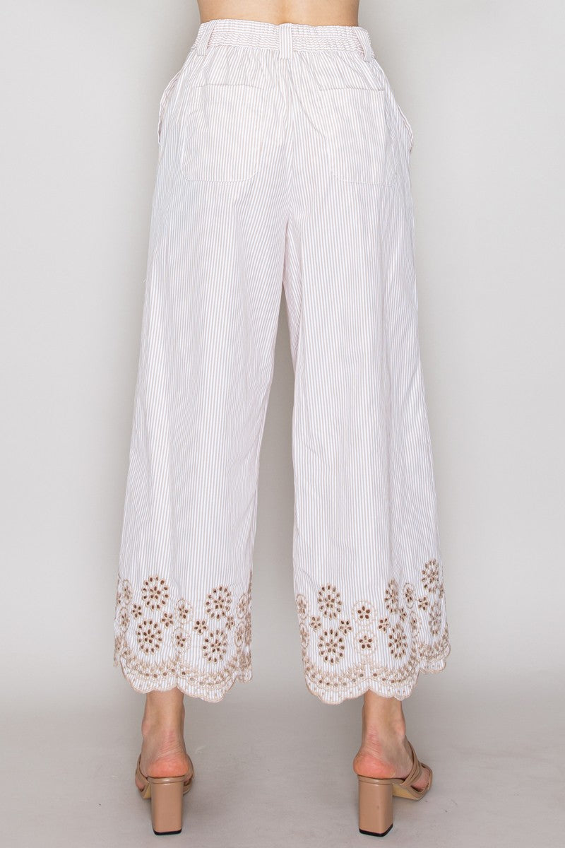 Pantalón de rayas con encaje en ruedo y corte amplio.