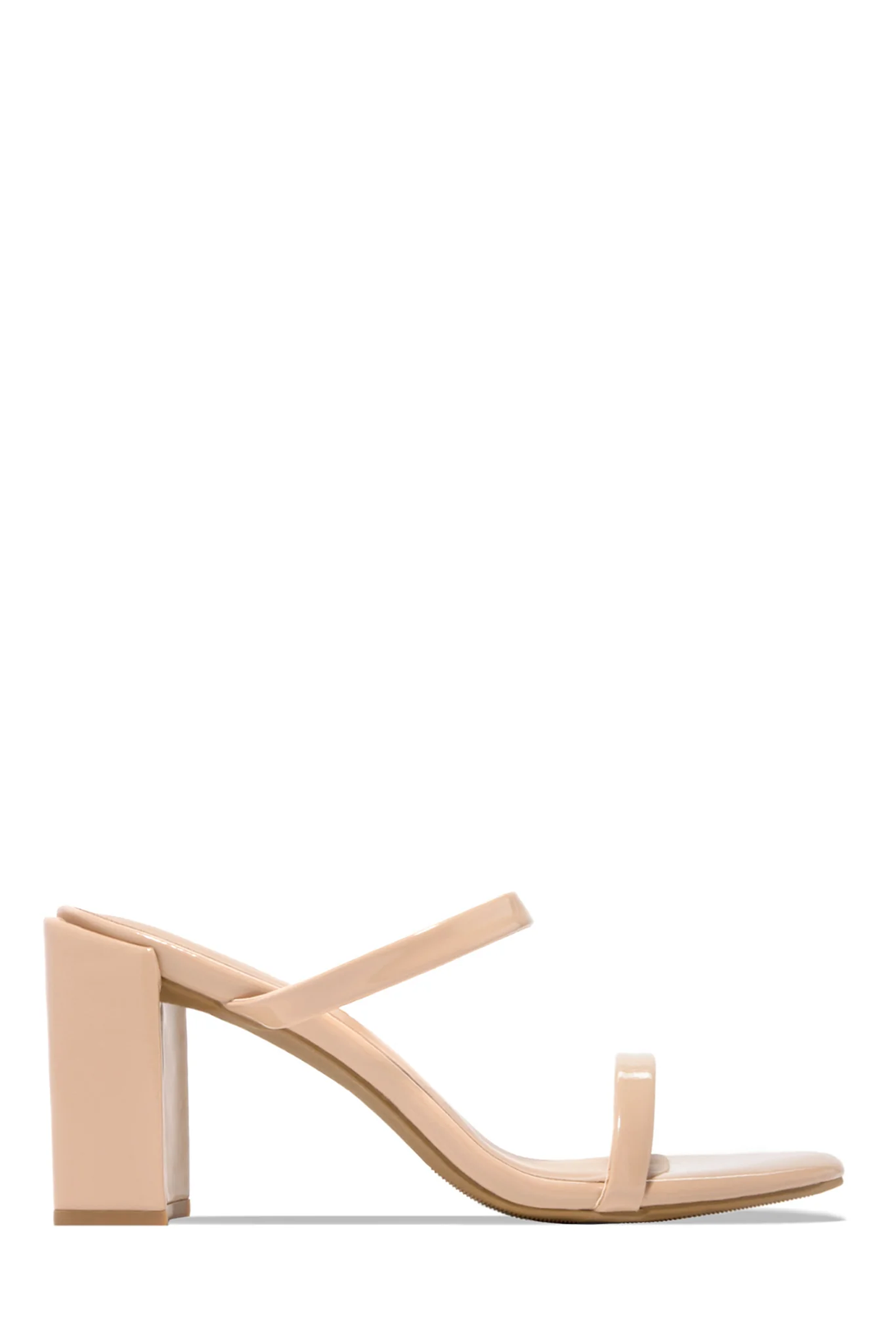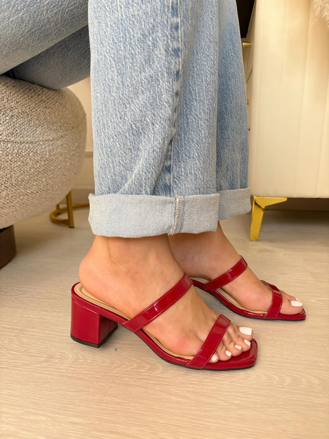 Sandalia con tiras de material sintético diseño de dos tiras tacón tipo bloque plantilla lisa suela sintética altura aproximada de 3.5 pulgadas.