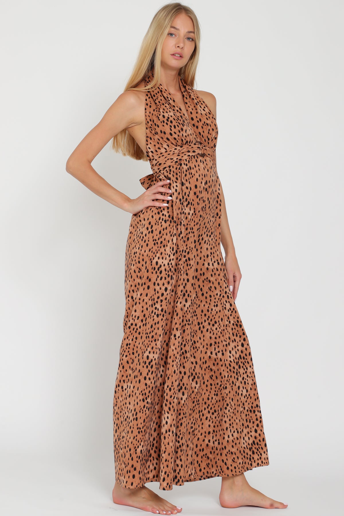 Vestido largo halter con escote cruzado y caída fluida de estilo natural.