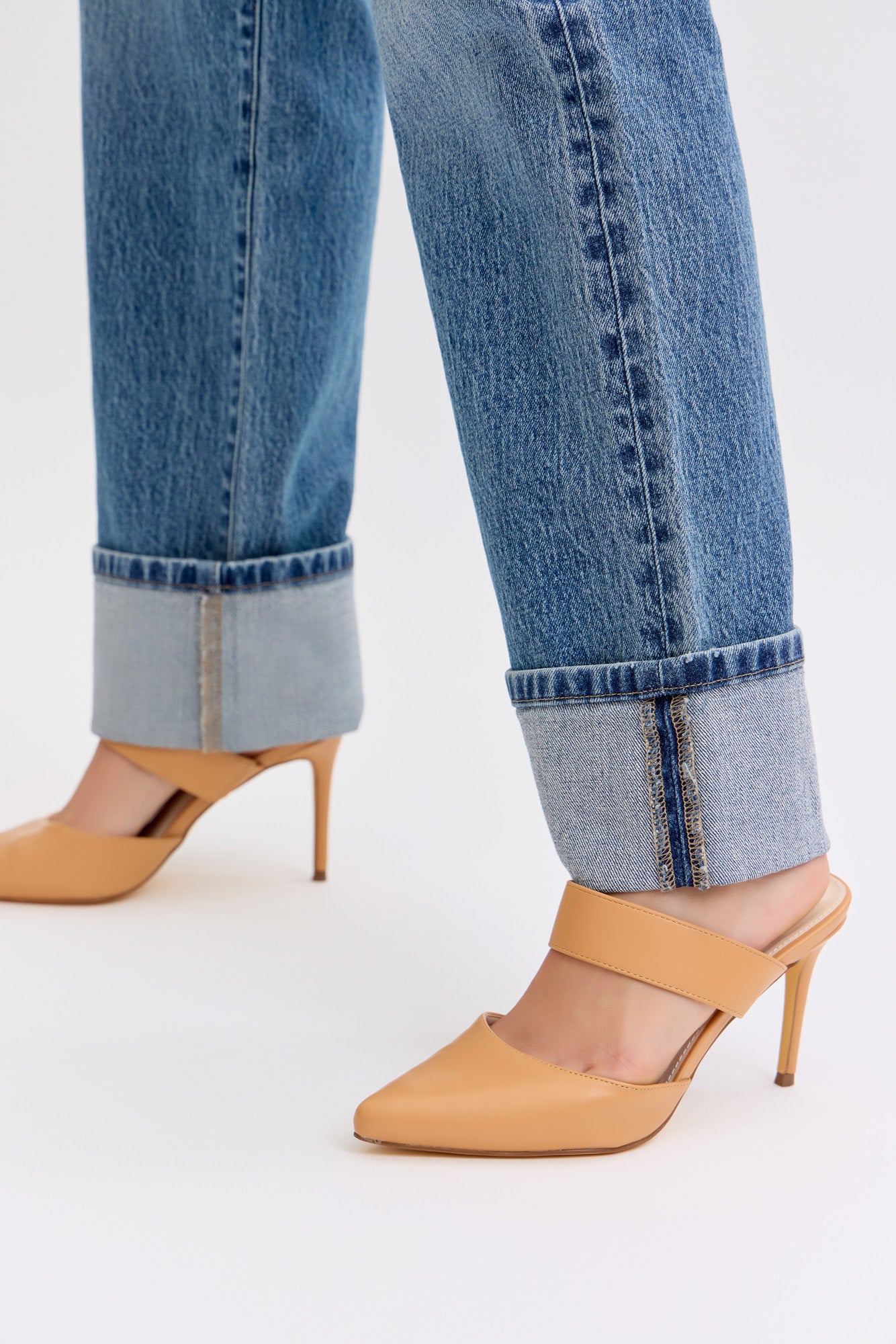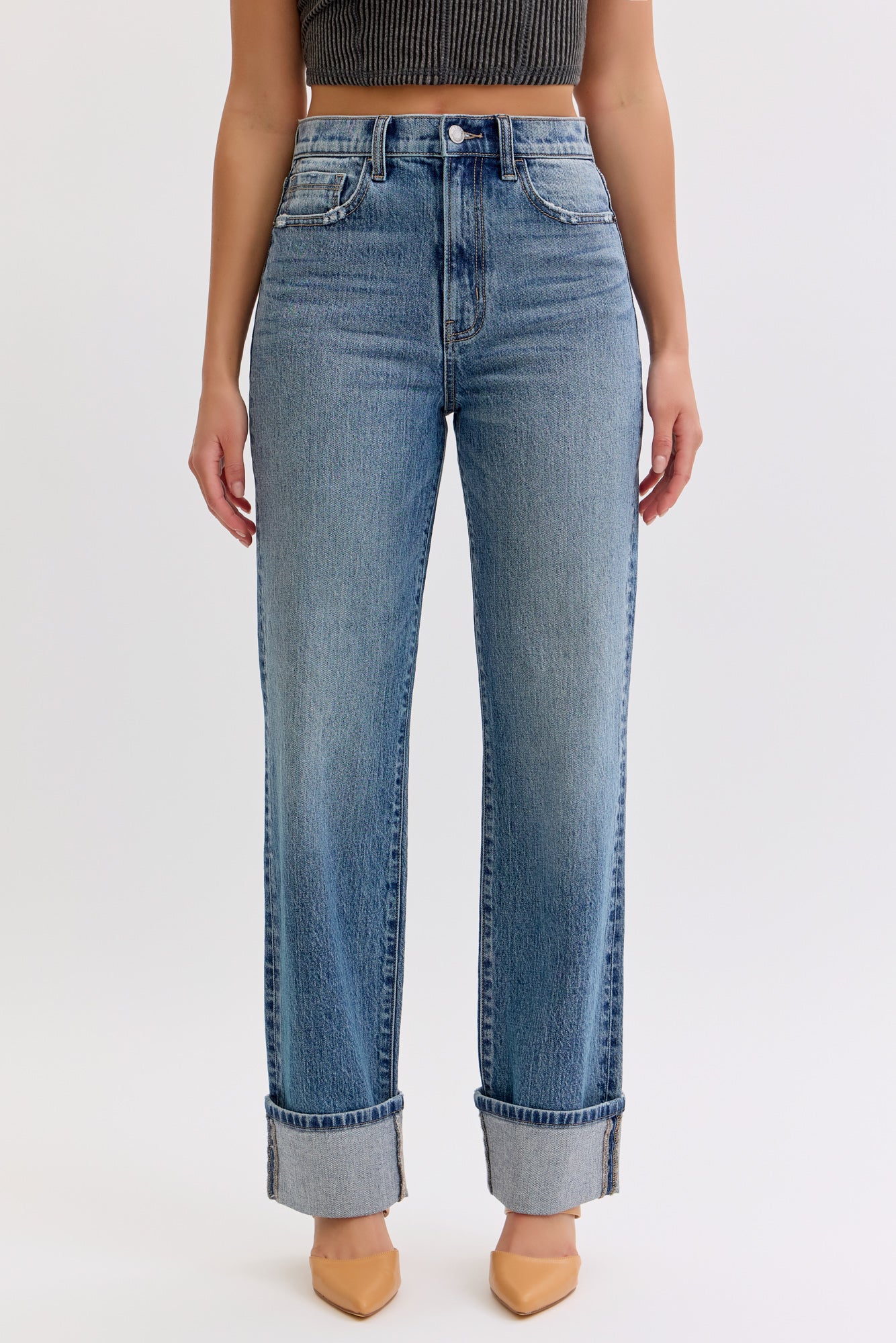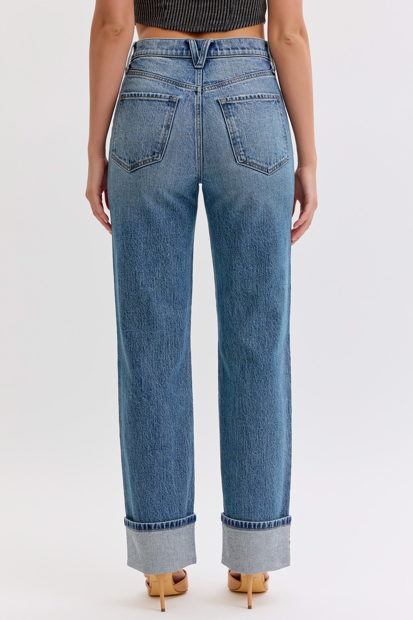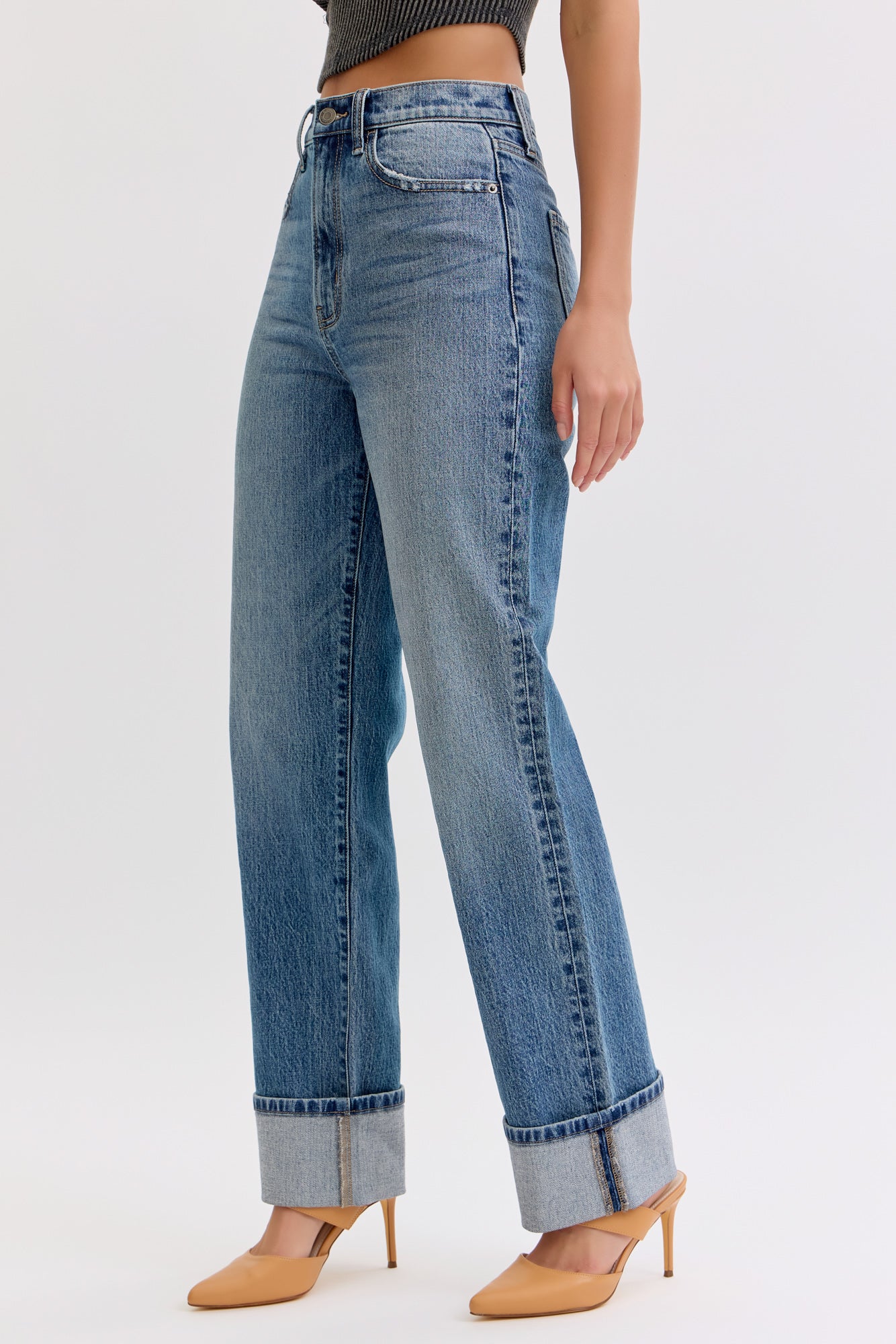 Jean azul medio de corte recto con dobladillo ancho y estructura rígida que define la pierna de forma estilizada.